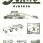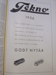 Ovenfor til venstre annonce i Legetøjstidende fra november 1956, hvor bybusserne fra de tre byer præsenteres. Sjovt nok var det Teknos plan at sælge busserne der, hvor de havde lokal interesse, men det var dog muligt for andre at indgive ordre. I midten, notits fra samme blad også fra november 1956 og til højre en julehilsen fra Tekno fra januar 1957.