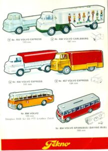 Volvo bussen blev eksporteret til alle de markeder, som Tekno normalt eksporterede til. Men til det svenske marked, har jeg en del materiale, som kan afdække en del om de svenske modeller. Svenskerne fik bussen allerede fra starten. I en prisliste fra juli 1956 er tre modeller oplistet, nemlig “Stockholms Spärvägar“, Linjebuss” og Postdiligens“. Prisen var 8,75 skr.